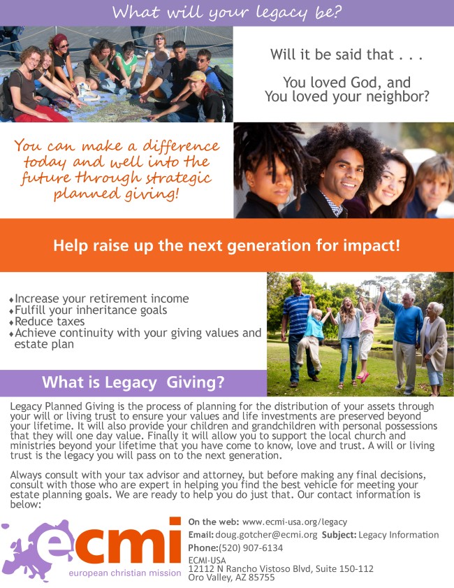A bequest is one of the easiest ways to invest in the Kingdom of God. With the help of your attorney and financial advisors, you can include language in your will or trust specifying gifts to family, friends or ECMI as part of your estate plan. You can also make a bequest using a beneficiary designation form for your retirement accounts or life insurance policies.
